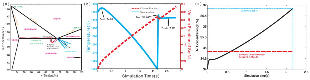 (a) Linearized phase diagram of Sc-Ni binary alloy from 52.27 at % Sc to 72 at % Sc constructed according to the recent thermodynamic assessment by Cao et al. [25]; (b) Temporal temperature curve (solid-line) and the volume fraction profile (dash-line) during simulation; (c) Ni concentration evolution near the ScNi grain.