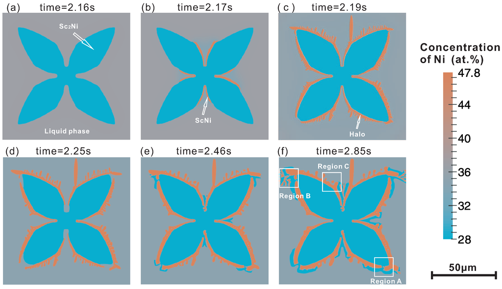 Figure 3 shows the phase-field simulated microstructure evolution in the present Sc-Ni binary alloy during solidification with the heat extraction rate 200 J/m. In Figure 3a–f, the microstructures at different time slides are presented respectively, i.e., 2.16 s, 2.17 s, 2.19 s, 2.25 s, 2.46 s and 2.84 s. According to the simulation results, the microstructure evolution in this ScNi-ScNi off-eutectic alloy can be divided into three stages.