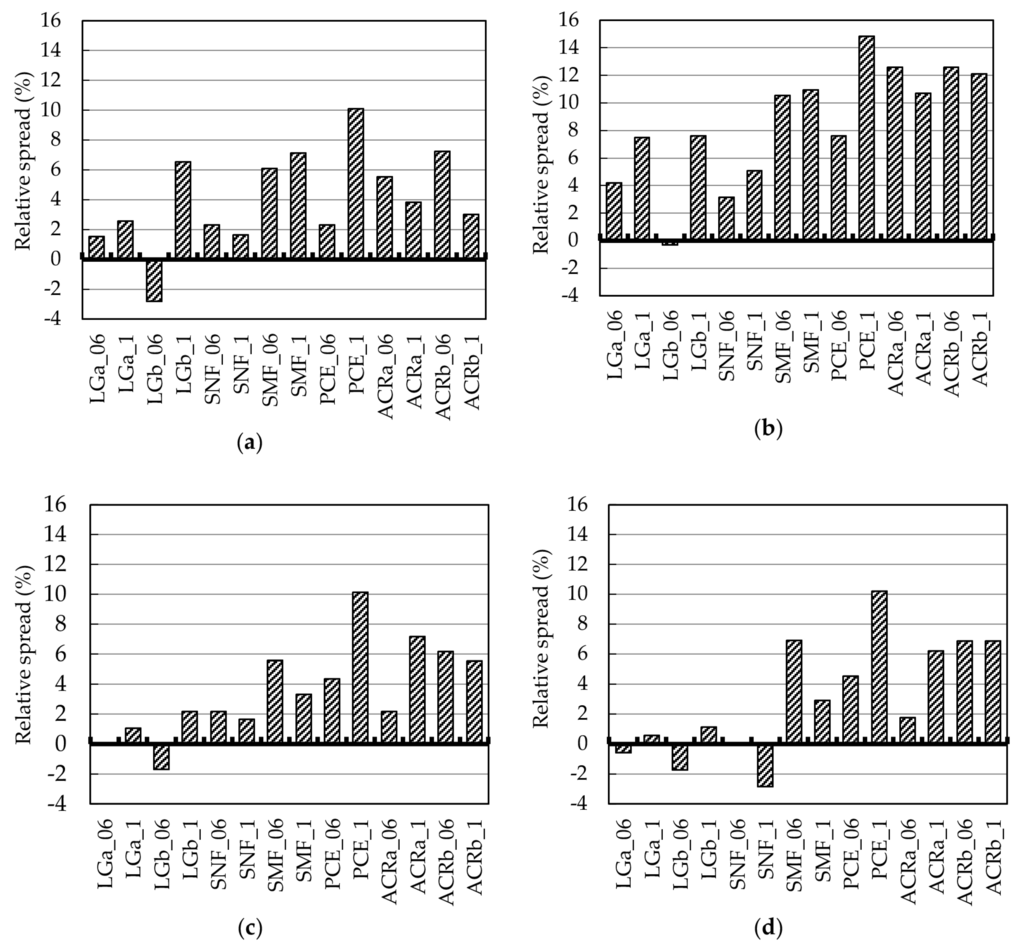 Workability of geopolymer expressed as relative spread (increase or decrease in %) of the geopolymer mixtures immediately (a) after mixing; (b) after 5 min; (c) 15 min; and (d) 30 min.