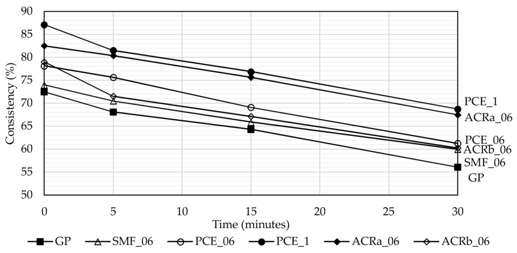 At t = 0’, the relative spreads of SMF_06, PCE_1, ACRa_06, and ACRb_06 mixtures are equal to 6.1%, 10.1%, 5.5%, and 7.2%, respectively, thus highlighting an increase in the flow diameter of these mixtures up to 10.1% compared to GP. For this reason, these SP were also tested on geopolymer mortar specimens.