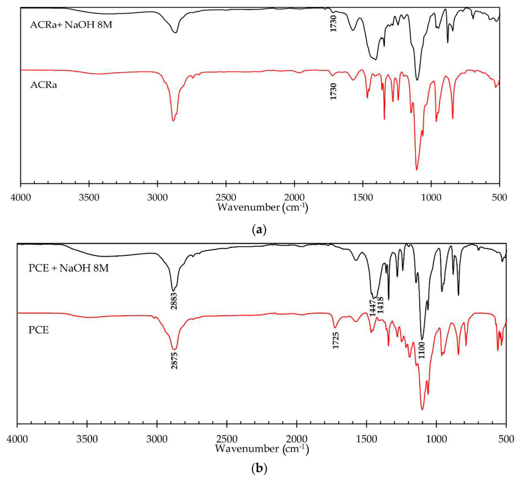 Fourier transform infrared spectroscopy (FT-IR) measurements were carried out by means of a PerkinElmer Spectrum Two instrument (Fremont, CA, USA). The spectra were recorded by attenuated total reflection (ATR) sampling technique on samples of PCE and ACRa admixtures, previously dried in a vacuum dryer. In order to test the chemical stability of PCE and ACRa in the alkaline solution media, the admixtures were also mixed with an 8 M NaOH solution (weight ratio 1:1). After 30 min of stirring, the solution was dried in a vacuum dryer and the sample spectra was registered.