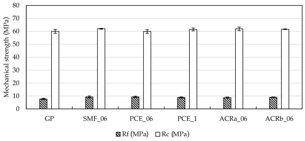 Flexural (Rf) and compressive (Rc) strengths were evaluated to determine if the use of SP affects the mechanical properties of the hardened materials. The results are presented in Figure 4: the reference sample GP shows a compressive strength equal to 60.0 ± 1.5 MPa and the relevant values for the samples containing SP are between 60–62 MPa. A similar behavior is also detected for flexural strengths, where GP exhibits a value of 7.7 ± 1.1 MPa and samples with SP are about 9 MPa.