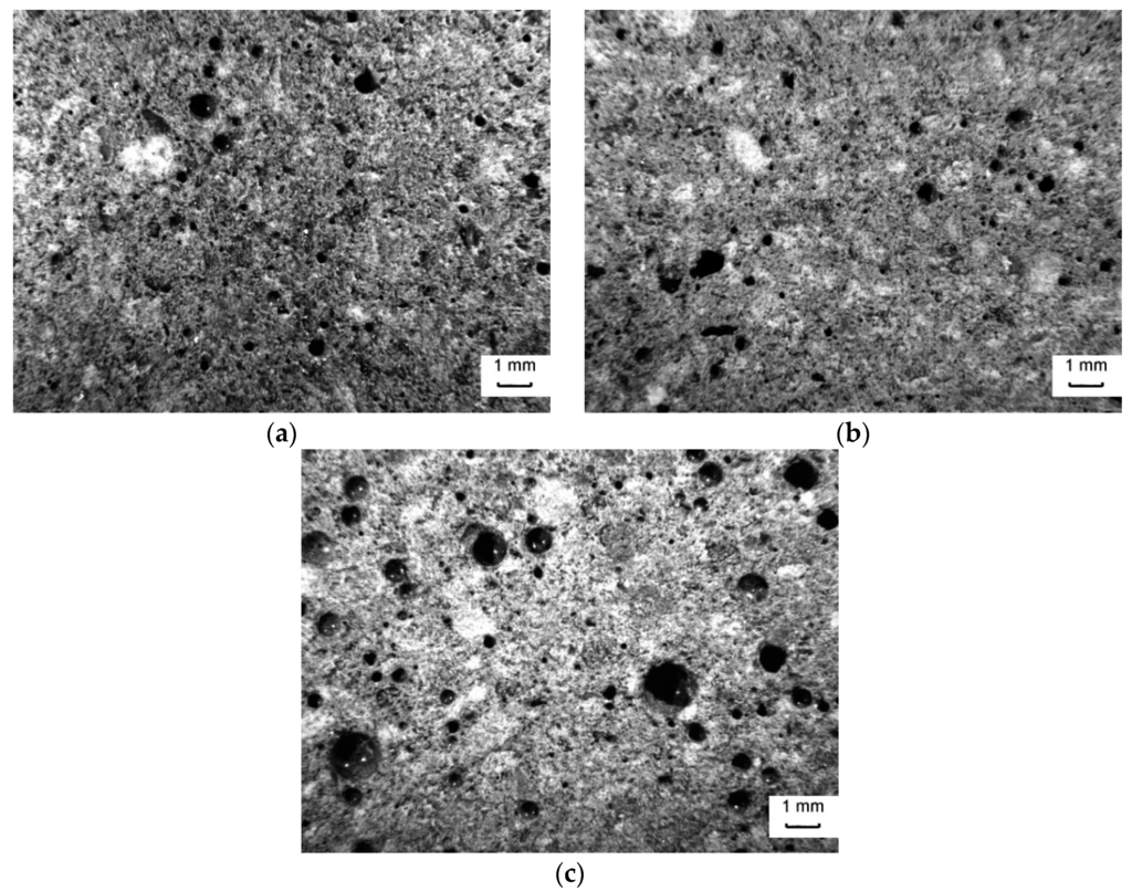 Optical images of geopolymer mortars after 28 days of curing: (a) PCE_1; (b) ACRa_06; and (c) GP. (Magnification 8×).