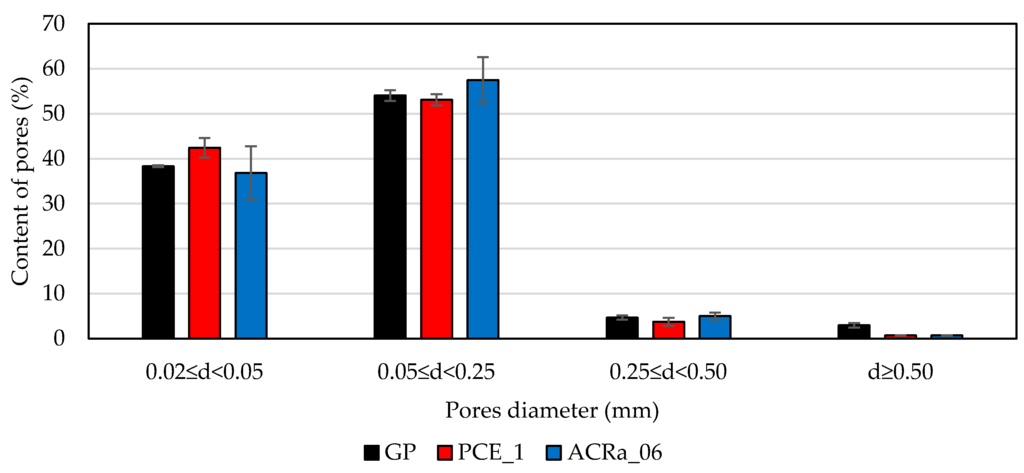 Reporting the content % of pores arranged per ranges of pore diameters (d) obtained by imaging analysis of two analyzed areas per sample (Figure 6), it is confirmed that GP is the sample with the highest amount of pores with d ≥ 0.50 mm. The content of pores with diameters in the range 0.05 ≤ d < 0.25 mm and 0.02 ≤ d < 0.05 mm is similar for all the formulations. The total porosity (Pt) determined by imaging analysis follow this order Pt_GP (11.7%) > Pt_ACRa_06 (9.0%) > Pt_PCE_1 (6.8%) indicating that even if the air content in the mortar samples at the fresh state is similar, the lowest workability of GP does not allow the entrapped air to easily quit, thus promoting large pore formation.