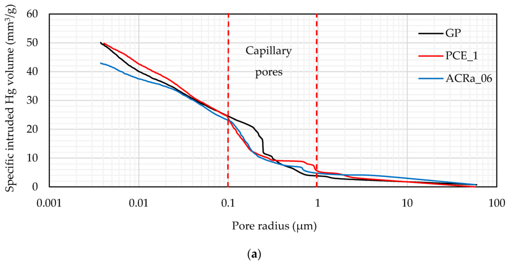 The results of MIP analysis are plotted in Figure 7. Unlike microscopy analysis, MIP allows the investigation of open porosity between 0.04–70 μm. The open pore size distribution curves of samples GP, PCE_1, and ACRa_06 appear to have similar trend, even if the main differences occur in the pore radius range 0.1–1 μm, the so-called capillary pores. In particular, the detected average pore radius is 0.21, 0.12, and 0.16 μm for GP, PCE_1, and ACRa_06, respectively, highlighting a pore refinement for samples where SP was added. Reporting the pores content at two different intervals of radius in the capillary range, it is highlighted that GP mortar contains a lower and higher content of pores with radius between 0.1 ≤ r < 0.3 and 0.3 ≤ r <1 μm, respectively, than PCE_1 and ACRa_06 mortar samples, whereas the total content of capillary porosity is very similar for all the three mixtures (about 40% of the relevant total open porosity).