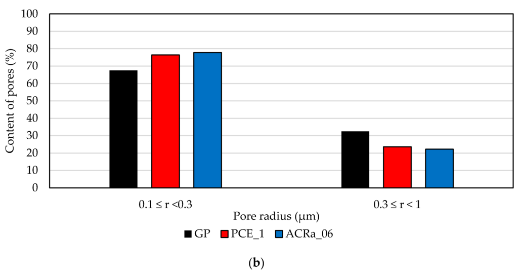 (a) Pore size distributions curves of the investigated geopolymer mortar samples; (b) content % of pores arranged per ranges of pore radius (r) within the range of 0.1 ≤ r < 1 μm.