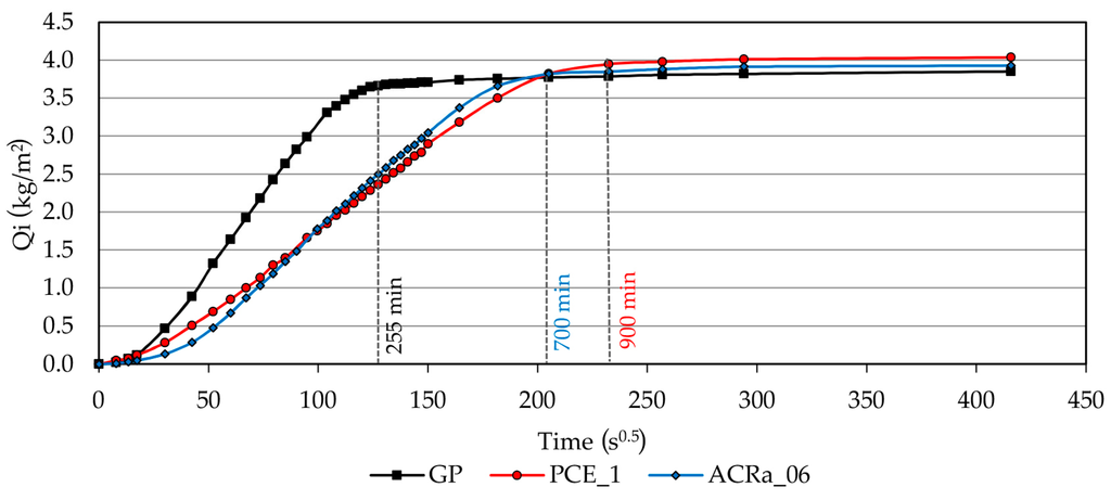 In order to investigate the degree of pores interconnectivity, a capillary water absorption test was also carried out. The data (Figure 8) shows that all the three mixtures, at the end of the test, reach similar values of water absorbed per unit area, thus indicating a similar total open porosity interconnectivity. However, GP sample saturates after 225 min (≈4 h), whereas ACRa_06 and PCEa_1 samples reach the saturation after 700 min (≈12 h) and 900 min (15 h), respectively. The results show that a different distribution in capillary pores as detected by MIP plays an important role in the saturation rate. The highest content of small capillary pores (0.1 ≤ r < 0.3 μm) detected for PCE_01 and ACRa_06 samples slows down the saturation rate [47] and, consequently, increases the material durability.