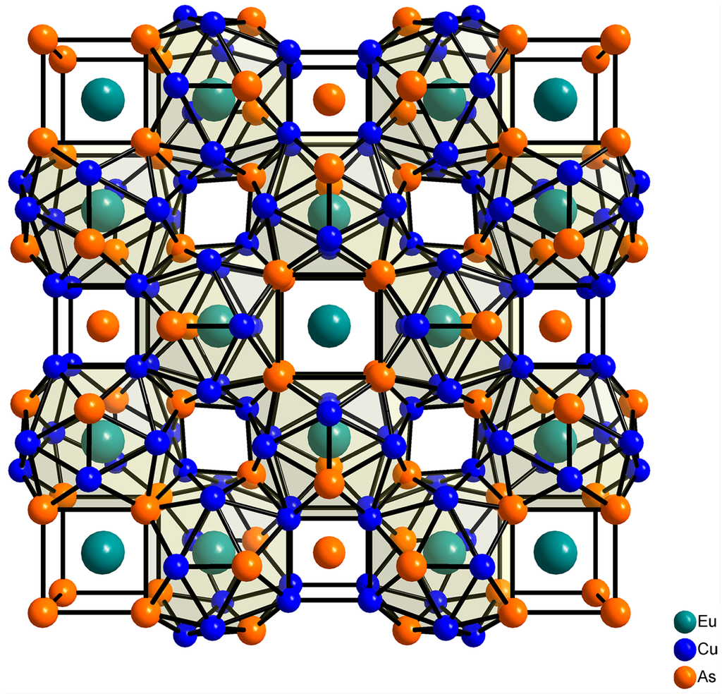 A combination of europium, copper, and a group 15 metals gives rise to a broad family of ternary compounds with a great variety of crystal structures and properties. The structures range from pseudo-layered—related to the types known for Fe–As based superconductors [7,8]—to truly three-dimensional structures, in which europium occupies large voids and displays high coordination numbers. The vast majority of these compounds contain divalent europium, with the 4f7 ground state configuration giving rise to strong paramagnetic response and, eventually, magnetic ordering. It is worth noting that the pseudo-layered compounds typically feature antiferromagnetic (AFM) ordering [7], whereas ferromagnetic (FM) ordering is rare—Eu2Cu6P5 and EuCu4P3 being the only examples [9]. On the contrary, compounds with 3D structures frequently display FM ordering, as in the clathrate compound EuxBa8−xCu16P30, exhibiting a superstructure of the type-I clathrate [10], and in the recently discovered clathrate-like compound Eu7Cu44As23 [11]. Whereas the former is a typical clathrate compound whose structure and properties can be rationalized using the Zintl–Klemm approach, the latter phase is an unbalanced metallic compound. Its resemblance to clathrates is ensured by a high coordination number of the Eu2+cations. In its crystal structure (Figure 1), two types of Eu2+cations alternate, one of which resides in a cubic environment of eight arsenic atoms, whereas the other one sits in the center of a 20-vertex polyhedral void. Low-temperature thermodynamic measurements revealed ferromagnetic behavior of Eu7Cu44As23 below 17.5 K, owing to the interaction between the localized 4f7 Eu2+cations, presumably through the conducting Cu–As framework.
