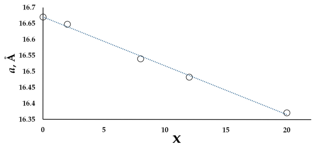 An optimal synthetic procedure for the solid solutions is almost the same as for the parent compound. The only difference is that we had to increase the annealing time by 48 h in order to reach equilibrium. The largest homogeneity range was observed for T = Ni, with an almost linear (Figure 2) decrease of the unit cell parameter from a = 16.6707(2) Å [11] for the undoped phase to a = 16.3719(1) Å for the sample with x = 20 (the sample with the nominal composition Eu7Cu24Ni20As23 contains up to 5% EuNi5As3). The homogeneity range for Co and Fe were found to be narrower, with the substitution limit of x = 8.
