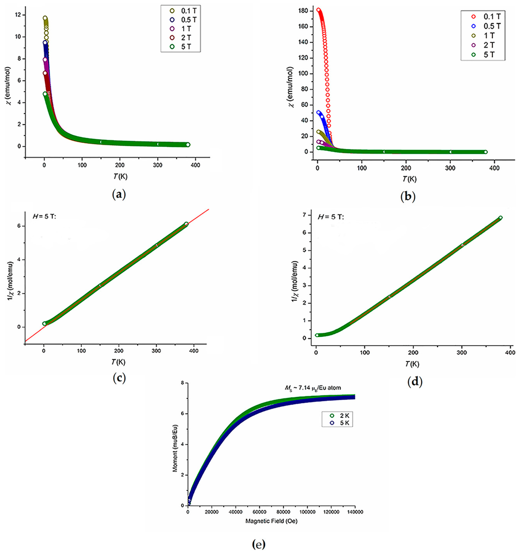 The former sample behaves as a typical Curie–Weiss paramagnet (Figure 6c), with the Weiss temperature only slightly exceeding zero, θW = 0.95 K. A deviation from the Curie–Weiss behavior at low temperatures with a visible increase of the magnetic susceptibility likely stems from minor paramagnetic impurities. The calculated magnetic moment Meff = 8.32 μB per Eu-atom is noticeably higher than the expected value for pure Eu2+ (Meff = 7.94 μB for J = S = 7/2), indicating that some contribution from iron is also present. Assuming additivity of the magnetic moments, where a square of the effective moment is a sum of the squares of individual moments, we obtain