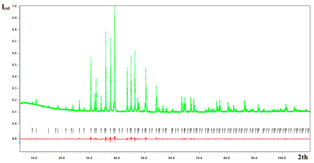 - Petříček, V.; Dušek, M.; Palatinus, L. Crystallographic Computing System JANA2006: General features. Z. Kristallogr. 2014, 229, 345–352. [Google Scholar] [CrossRef]