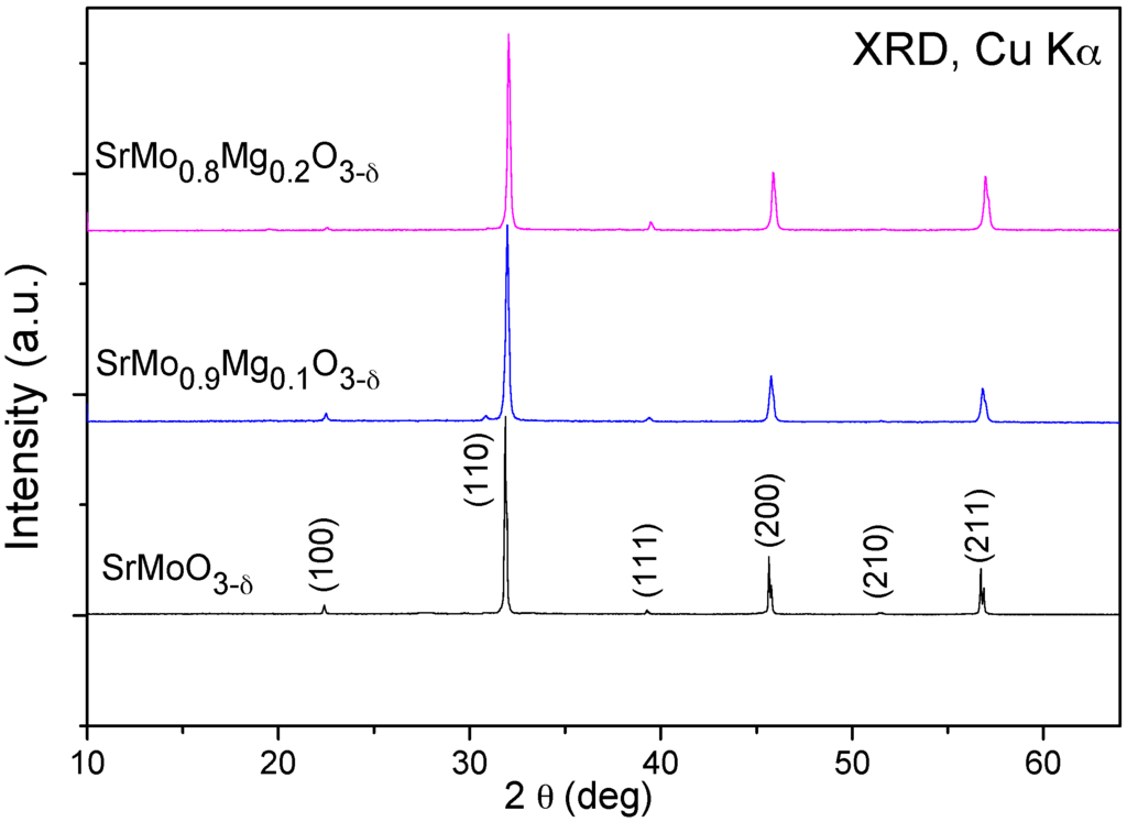 XRD patterns with CuKα radiation for SrMoO3 and SrMo1−xMgxO3−δ (x = 0.1 and 0.2), indexed in a simple cubic perovskite unit cell with a0 ≈ 3.95 Å.