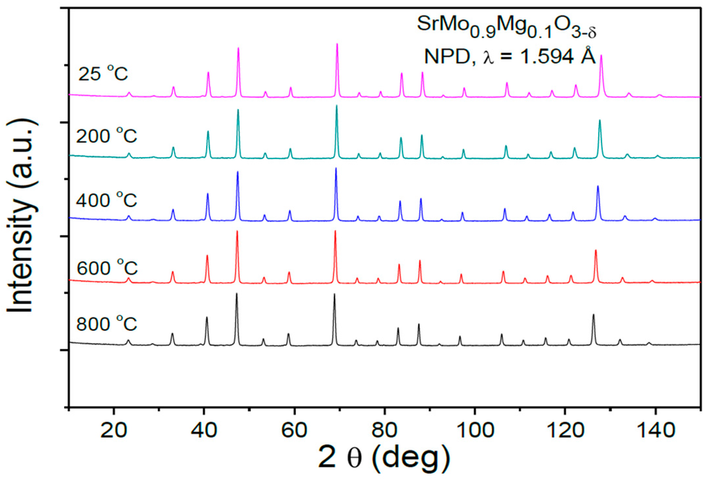 In order to perform a more comprehensive structural study for the SrMo1−xMgxO3−δ (x = 0.1 and 0.2) series, an investigation by NPD at room temperature (RT) for the SrMo1−xMgxO3−δ family and high temperature (up to 800 °C) for SrMo0.9Mg0.1O3−δ was carried out. The structures were refined in the Pm-3m group (No. 221), with Z = 1. Sr atoms are located at the 1b (½, ½, ½) position; Mo and Mg atoms are randomly distributed at 1a (0, 0, 0) sites; and the O oxygen atoms are placed at the 3d (½, 0, 0) position. A small oxygen deficiency was observed at room temperature after refining the occupancy factors of the oxygen atoms.