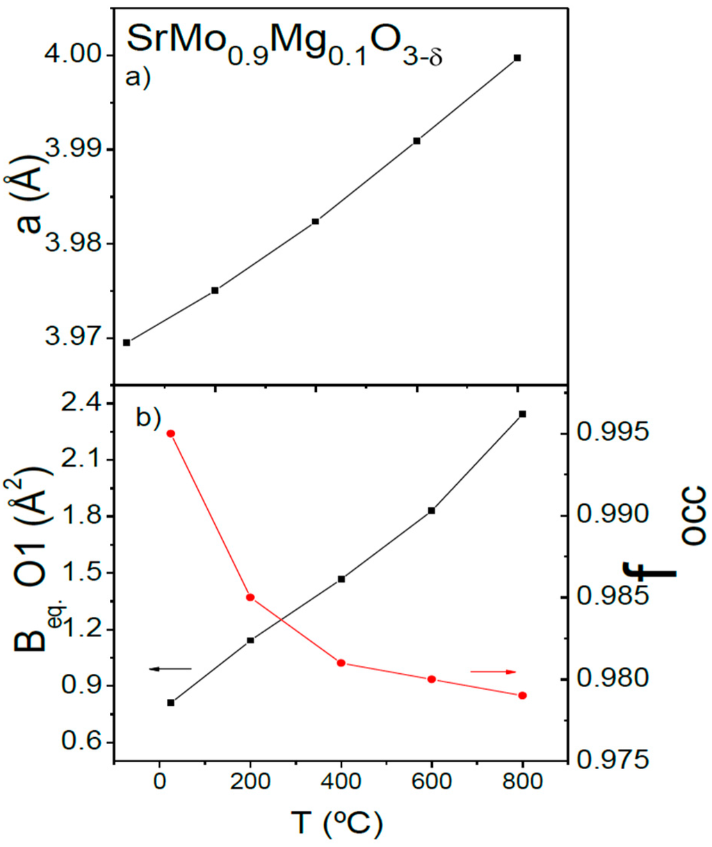 Figure 5a shows the temperature variation of the unit-cell parameters for SrMo0.9Mg0.1O3−δ. The unit-cell parameters monotonically increase when heating the sample due to the expansion of the chemical bonds. The thermal evolution of the oxygen content in air was also studied by neutron diffraction. Figure 5b (right axis) illustrates the temperature variation of the oxygen vacancies concentration for SrMo0.9Mg0.1O3−δ. The oxygen content decreases when heating the sample in vacuum from SrMo0.9Mg0.1O2.985(3) for x = 0.1, almost stoichiometric at room temperature, to SrMo0.9Mg0.1O2.937(3) at 800 °C. As the sample is heated, the mixed-valence Mo4+-Mo5+ is reduced to Mo4+, generating oxygen vacancies. Figure 5b (left axis) shows the equivalent isotropic displacement factors of oxygen atoms (Beq) increasing from 0.81 at 25 °C to 2.34 Å2 at 800 °C. This feature, along with the presence of oxygen vacancies, indicates a high mobility of these atoms, allowing the required O2− motion across the three-dimensional network and providing the material with a good ionic conductivity at the working temperatures of an SOFC.