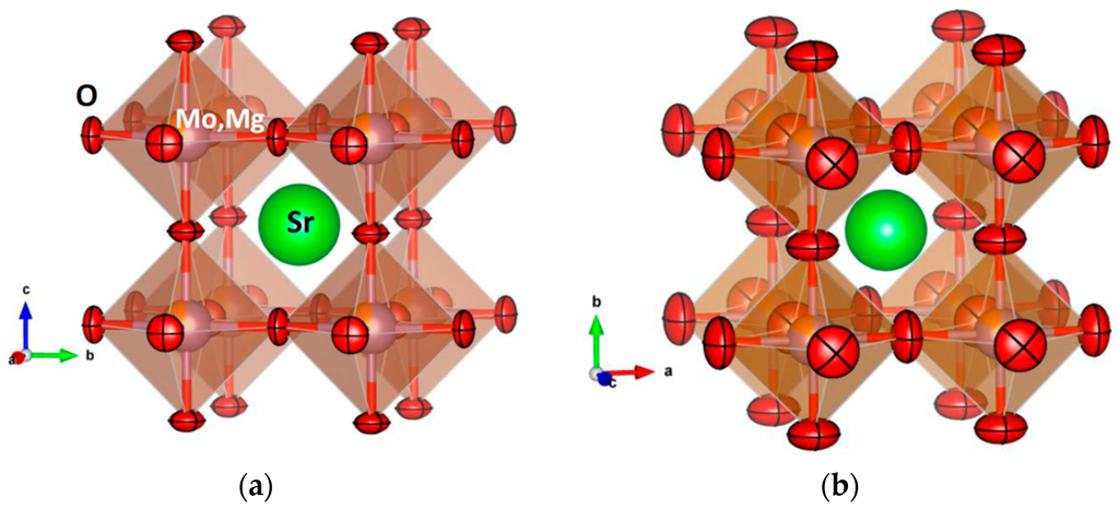View of the crystal structure of the SrMo1−xMgxO3−δ oxides, defined in a simple-cubic, primitive unit cell, showing the evolution of the thermal ellipsoids for oxygen atoms between (a) 200 °C and (b) 800 °C.