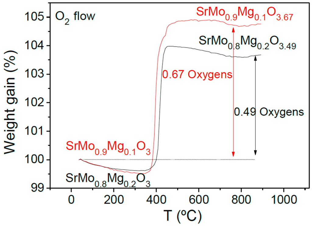 Thermal analysis in O2 flow (TG curve) of SrMo0.9Mg0.1O3−δ and SrMo0.8Mg0.2O3−δ perovskites, showing an oxidation step to a scheelite phase.