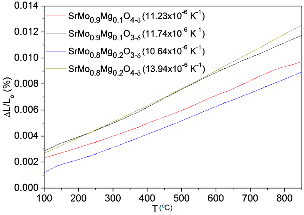 The TECs obtained for the perovskite and scheelite phases are reasonably similar and fit with the general SOFC electrolytes values, so no mechanical compatibility problems should be expected during the oxidation-reduction cycles. For the x = 0.1 compound, the TEC coefficients for SrMo1−xMgxO3−δ and SrMo1−xMgxO4−δ are indeed very similar, exhibiting values of 11.74 × 10−6 and 11.23 × 10−6∙K−1, respectively. For x = 0.2, there is a bigger difference (10.64 × 10−6 and 13.94 × 10−6∙K−1, respectively), which could induce a certain redox instability.