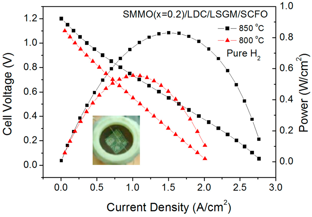 Cell voltage (left axis) and power density (right axis) as a function of the current density for the test cell with the configuration SMMO (x = 0.2)/lanthanum-dope ceria (LDC)/LSGM/SCFO in pure H2 measured at T = 800 and 850 °C. The inset shows a view of the cathodic side of the single cell.