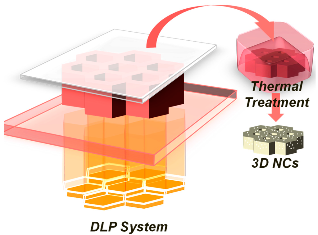 Sketch of Digital Light Processing (DLP) setup that projects dynamic digital masks on the photocurable formulation featuring the formation of the polyethylene glycol diacrylate structure. Subsequent Thermal treatment, with the formation of the silver nanoparticles by reduction of the metal precursors.
