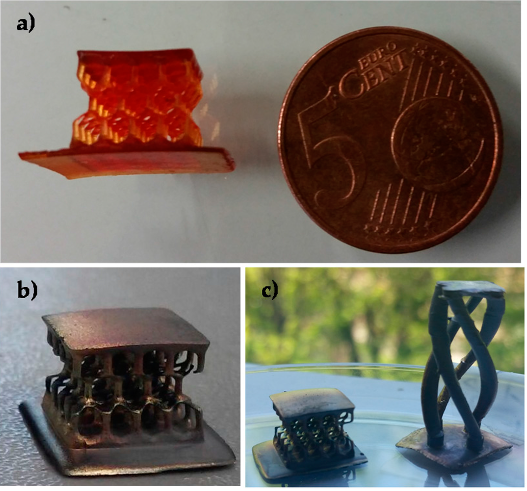 3D objects produced by DLP technique from the formulation containing polyethylene glycol diacrylate (PEGDA) and 15 phr of silver nitrate. (a) Honeycomb structure as printed; (b,c) samples after the thermal treatments; the metallic aspect induced by the presence of the silver nanoparticles is clearly visible.