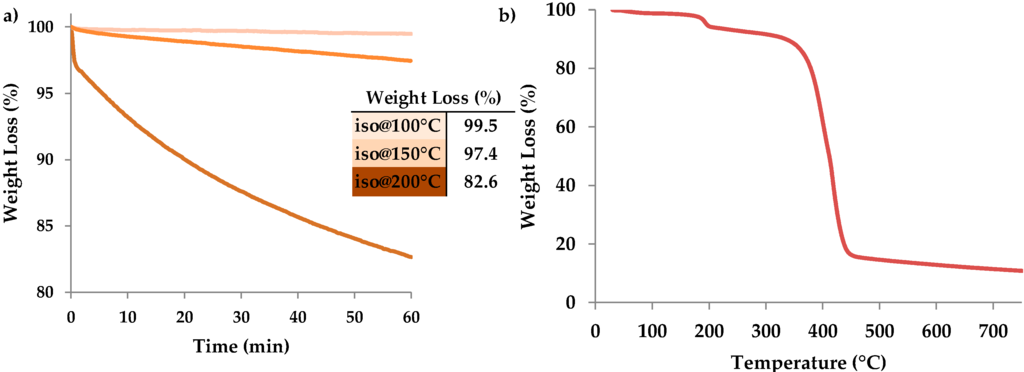 (a) Isothermal treatments performed in air at different temperature (100 °C, 150 °C and 200 °C); (b) thermogravimetric analysis (TGA) plot of the sample PEGDA_15 phr AgNO3 heated in nitrogen at a rate of 10 °C/min.
