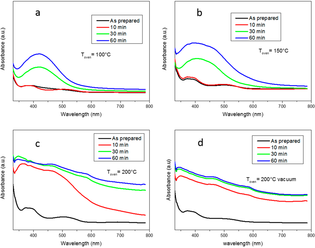 UV-Vis plots of samples treated at (a) 100 °C; (b) 150 °C; (c) 200 °C in air and (d) 200 °C in vacuum obtained after different heating times.