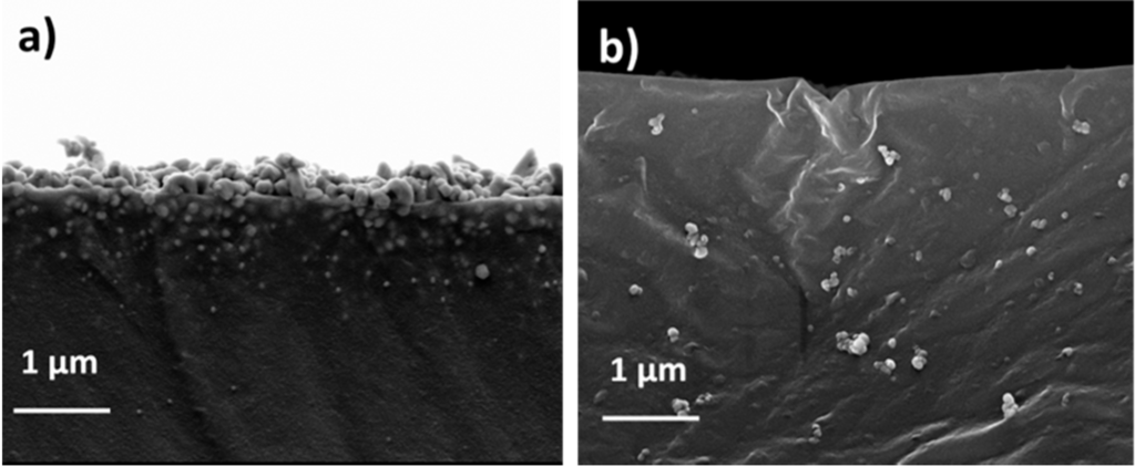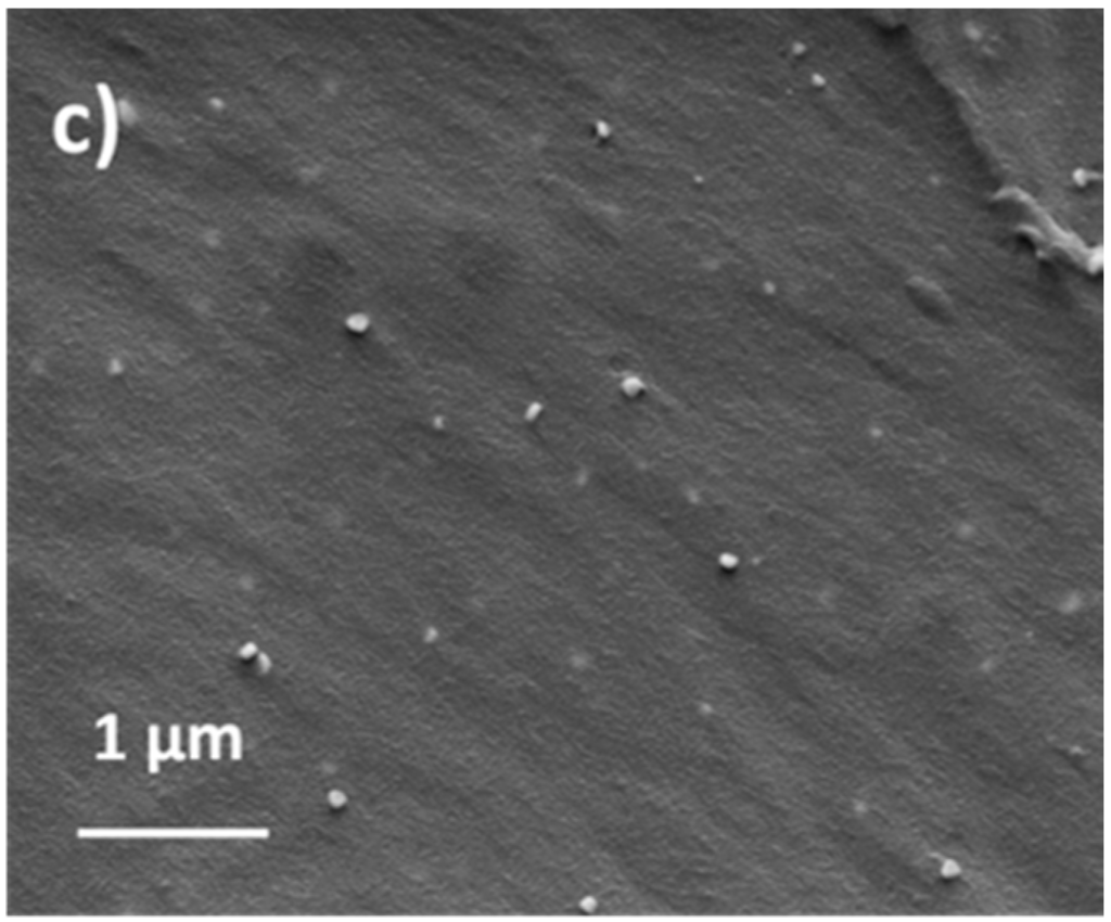 Shape and distribution of the silver nanoparticles into the printed polymeric matrices were investigated by Field Emission Scanning Electron Microscopy (FESEM) (Carl Zeiss AG, Jena, Germany). FESEM images of the 3D printed samples containing 15 phr AgNO3 after different thermal treatments are displayed in Figure 5; the formation of nanoparticles in the 3D structures is confirmed and, as can be observed from the figure, the silver nanoparticles are generally spherical in shape and relatively uniformly-dispersed inside the matrix. It is interesting to note that an important morphological difference clearly appears between the samples: Size, shape and distribution of silver nanoparticles into the matrix are different when the samples submitted to a post treatment at 200 °C in air (Figure 5a) or in vacuum (Figure 5b) are considered: In the first case, large unstructured aggregates are present at the surface, probably due to thermal oxidation (Figure 5a) while in the latter case smaller and more homogeneously dispersed nanoparticles are visible (Figure 5b).