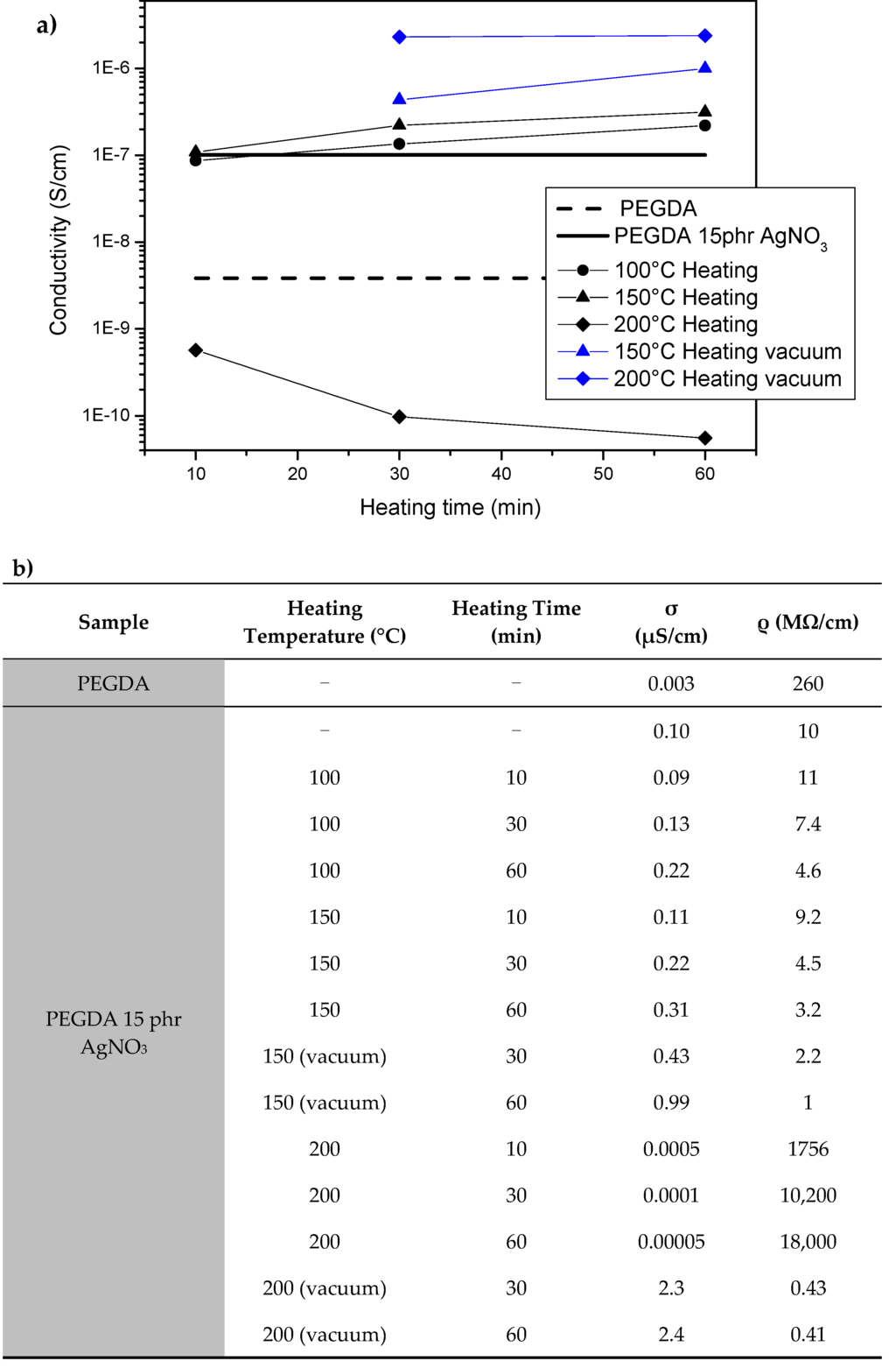 The electrical properties of the printed materials were then evaluated; firstly, the resistivity of flat printed specimens was measured by sandwiching them between copper electrodes. Figure 6a shows the relationship between the measured resistance and heating temperatures, the data are then reported in Figure 6b. The NC containing silver nitrate is two orders of magnitude more conductive than the neat polymeric matrix. This could be related to the presence of the conductive fillers dispersed in the polymeric matrix. Consequent thermal treatments in air condition up to a temperature of 150 °C, even for long periods of time, do not influence NCs resistivity, always keeping values of the order of some MΩcm. Those values are compatible with a hopping-controlled conduction mechanism [49], meaning that the NPs nucleation-growth mechanism induced by the temperature decreases the medium distance between the NPs, causing a moderate decrease of resistivity but not sufficient to guarantee an efficient percolating path.