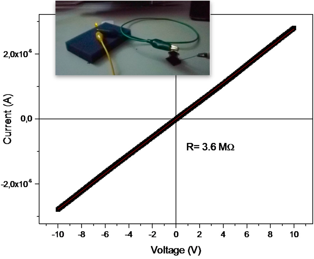 In a recent work we reported about the fabrication of 3D printed object containing silver salts in which the subsequent Ag NPs reduction was performed by means of UV irradiation. The resistivity values obtained after 1 h of thermal treatment at 200 °C are in line with the values obtained for a sample UV irradiated for 10 min, indicating that with this NCs UV reduction seems more efficient in the realization of conductive 3D structures. At last we performed electrical measurements also on 3D structures, as example we reported the value for the sample heated at 200 °C for 1 h in vacuum, Figure 7. The current-voltage (I–V) curve results perfectly linear, showing a resistance of 3.6 MΩ. This value, although not very high, was sufficient to achieve the illumination of a led (Figure 6), thus envisaging a possible application in the market of electronics as dissipating material [50].