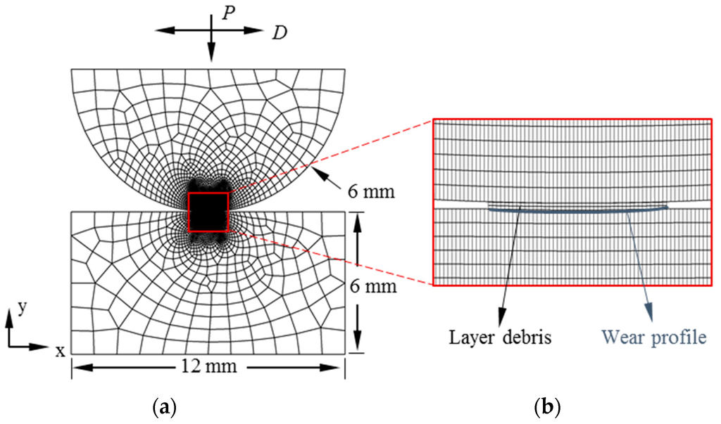In this paper, a 2D plane strain cylinder/flat FE fretting wear model with a debris layer (named debris layer model) was constructed to study its effects on the wear profile. A model without a debris layer was presented in our previous work [23]. Global dimensions of the model used herein are as follows: the radius of the cylindrical pad is 6 mm and the specimen is 12 mm × 6 mm, as illustrated in Figure 1. Fretting wear loads are realized in two steps. Firstly, a constant normal load is applied at the mid-point of the top surface on the pad. Only the vertical motion of the pad is allowed at this step. Next, the horizontal displacement is imposed at the same point as the normal load is applied. The movement of the specimen is fully constrained during the fretting wear simulation. A plane strain 4-node bilinear element is used in the first bodies (pad and specimen). The mesh size of the contact surface in the first bodies is 5 µm.