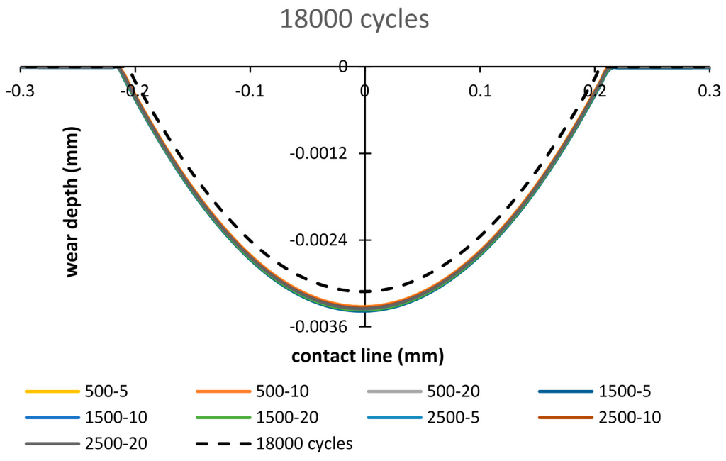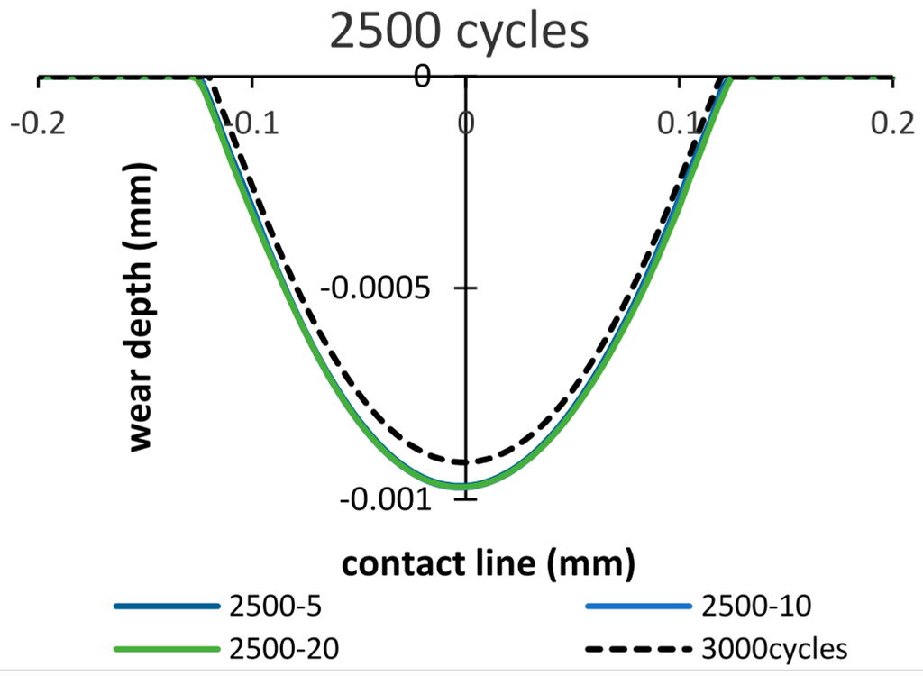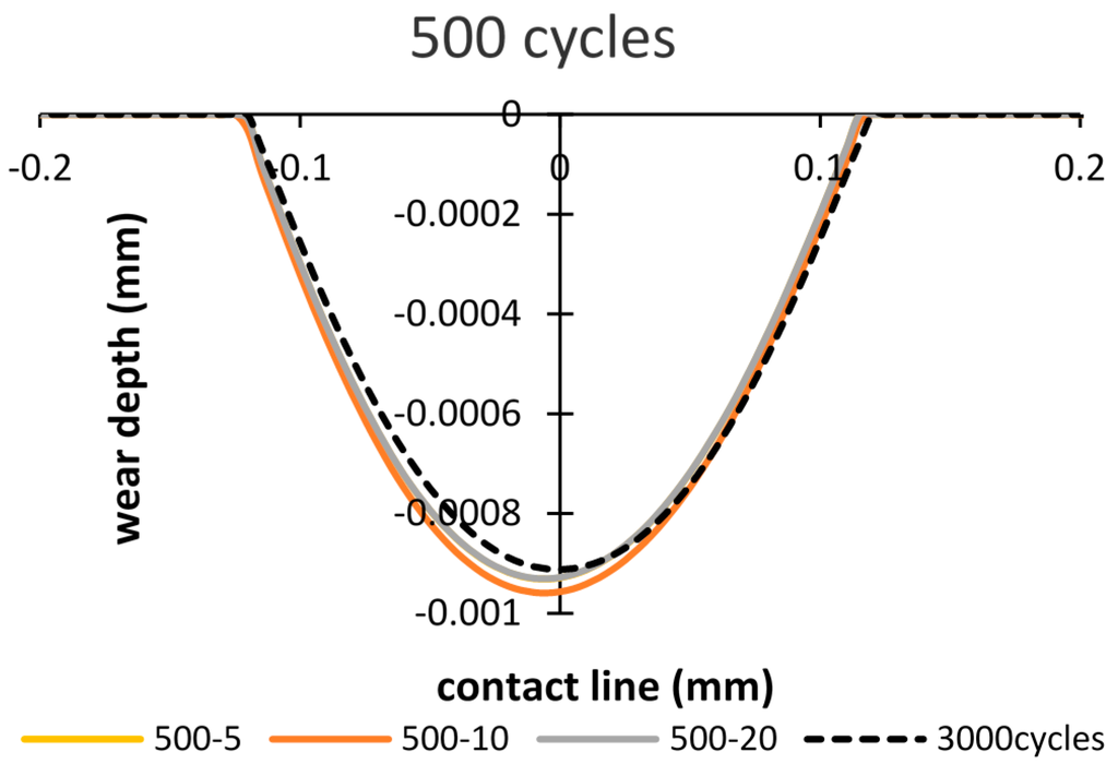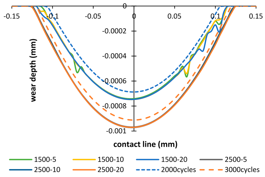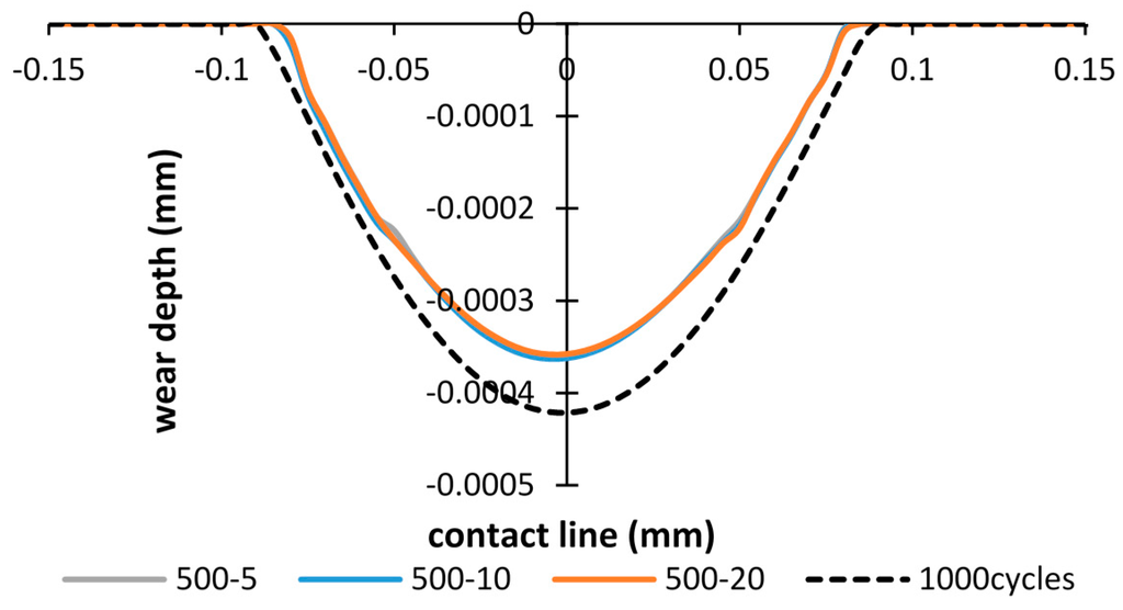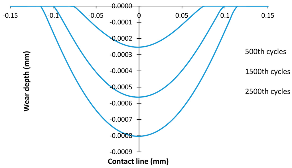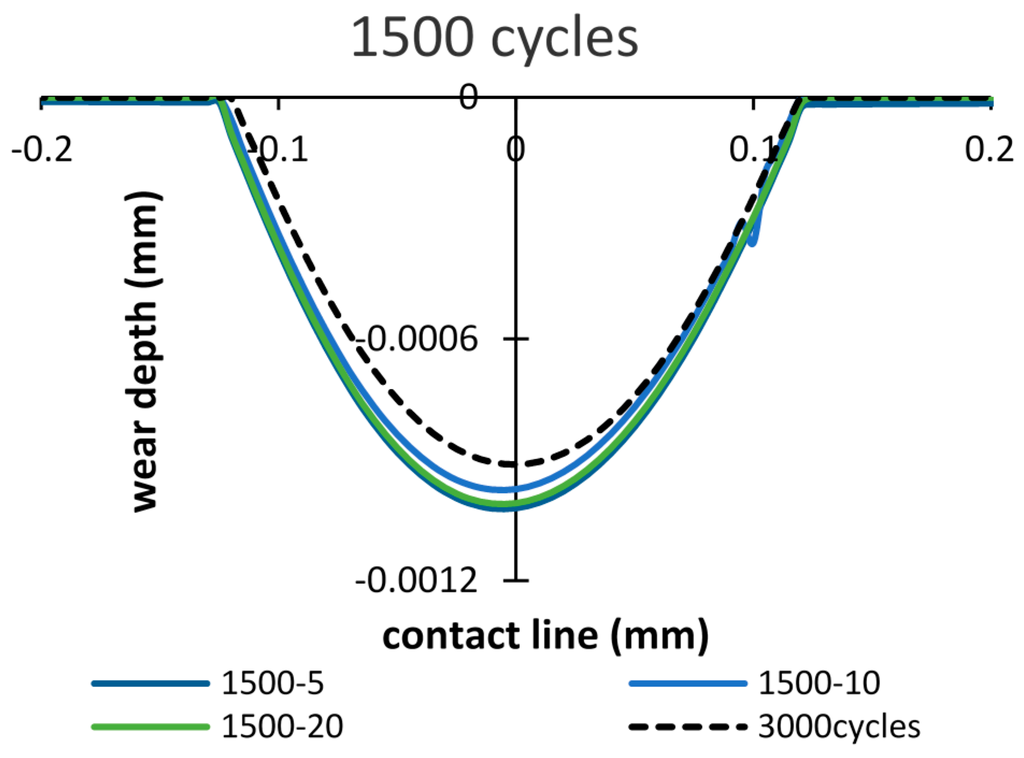 However, in the cases: importing time = 1500 and 2500 cycles (Figure 12), the opposite tendency is shown, i.e., more wear damage is generated in both cases. The wear depth increases by 8% and 6%, after 2000 cycles and 3000 cycles, respectively. Whereas, the wear width increases by 4.8% and 4.1% after 2000 cycles and 3000 cycles, respectively.
