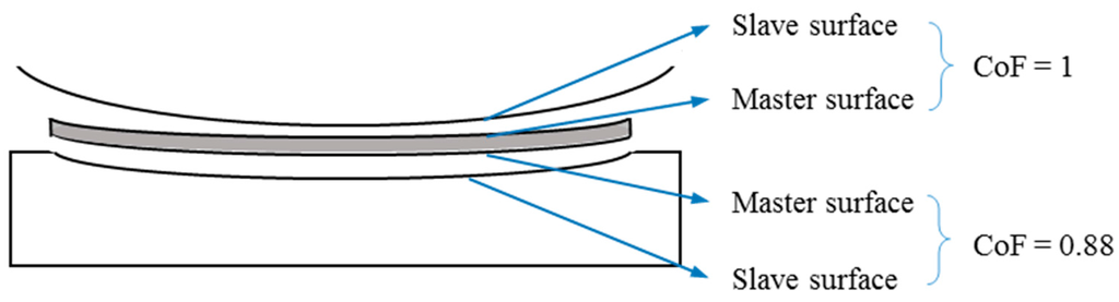In this debris layer model, two contact interfaces were created: (a) the contact surface between the pad and the debris layer and (b) the contact surface between the debris layer and the specimen. It is difficult to obtain the Coefficient of Friction (CoF) between these two interfaces separately by experimental measurements. However, CoF is also one of the important parameters to determine fretting behavior and wear extent. In this study, the CoF between the pad/layer is assumed to be equal to 1 and the CoF between the layer/specimen is taken as 0.88 based on the experimental data from Reference [17]. Usually, the debris of metallic fretting wear is a metallic oxide that is harder than the first bodies, therefore the top and bottom surfaces of the layer are defined as master surfaces for the pad/layer contact interface and the layer/specimen interface, respectively. These descriptions for the contact interfaces are also shown in Figure 3. For both interfaces, tangential behavior is constrained by the Lagrange multiplier method.