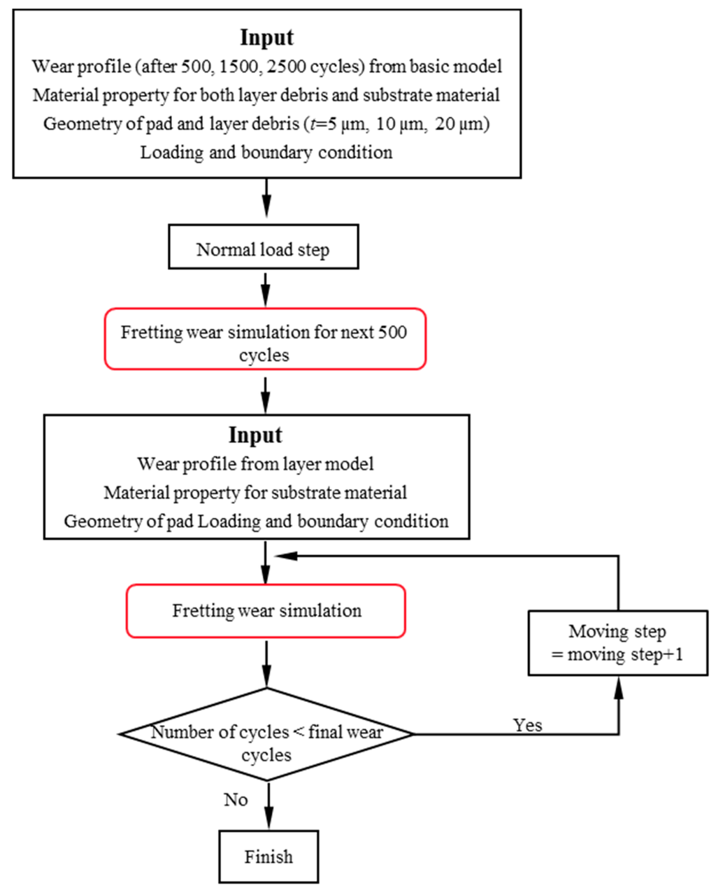 The fretting wear simulation with a debris layer follows the flowchart shown in Figure 4. The wear profile predicted by the basic model after a certain number of cycles is imported as the initial geometry in the debris layer model. Next, the constant normal load P = 185 N is applied at the mid-point of the top surface of the pad. In this step, only the vertical movement of the pad and layer are allowed, and the specimen is fully constrained except for the contact surface. Subsequently, a horizontal displacement with amplitude 25 µm is imposed at the same point as P to simulate fretting wear. Under this condition, the debris layer is restricted by the contact algorithm. The layer effect is simulated explicitly only for the next 500 wear cycles of the debris layer model and the influence of the layer is recorded in the evolution of the wear scar of the specimen. Therefore, the wear profile from the layer model is imported to the next wear simulation without the layer. Finally, the fretting wear is calculated with the jump cycle 1000 and 100 increments per jump cycle step, until the number of cycles reaches the final number of wear cycles, namely 18,000 cycles.