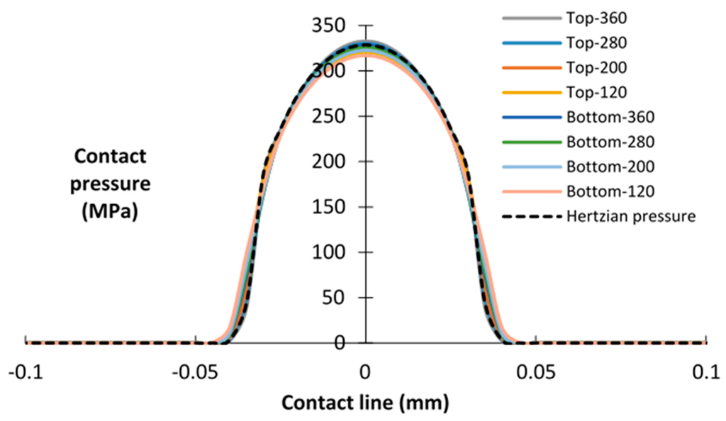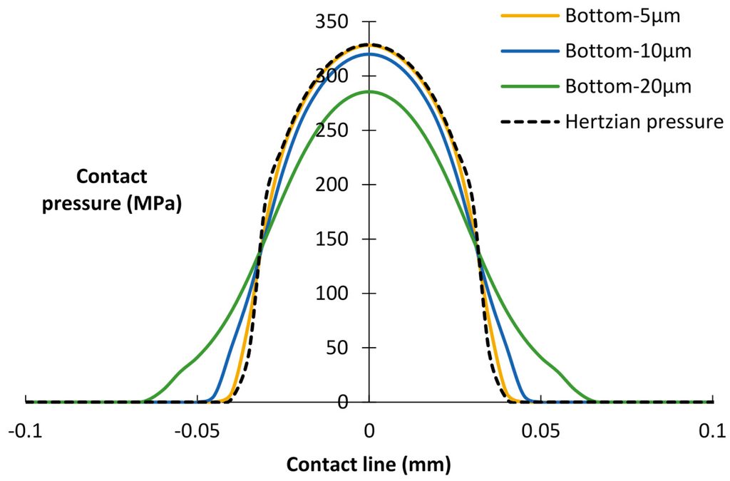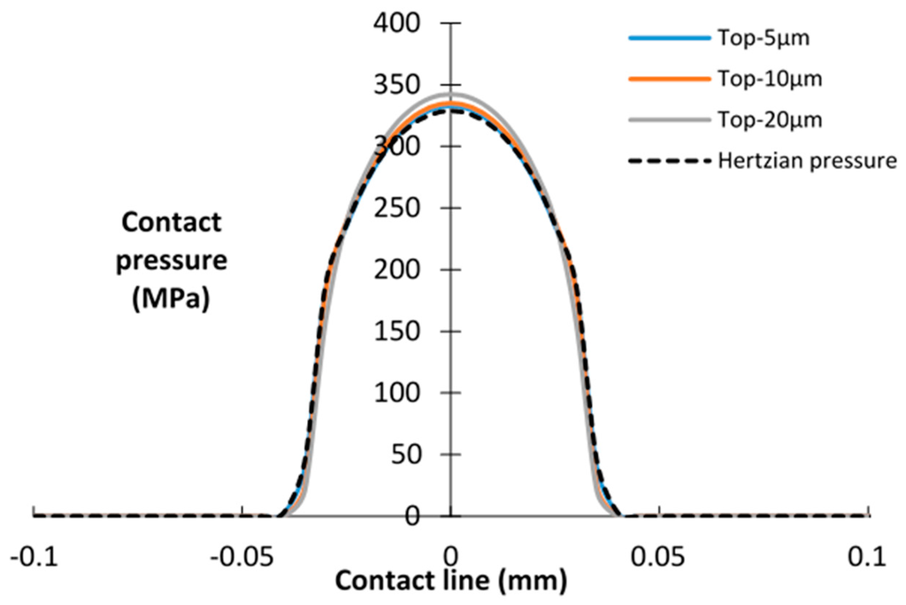 Next, the effects of the debris layer thickness on contact pressure were studied. As shown in Figure 6, little difference exists in the contact pressure distribution of the top interface. However, considering the bottom interface (Figure 7), the peak contact pressure decreases and the contact width increases with increasing thickness of the layers. It can be seen that a relatively thick layer carries more load and enlarges the contact area of the bottom interface. This tendency is also mentioned in the research of Reference [27].