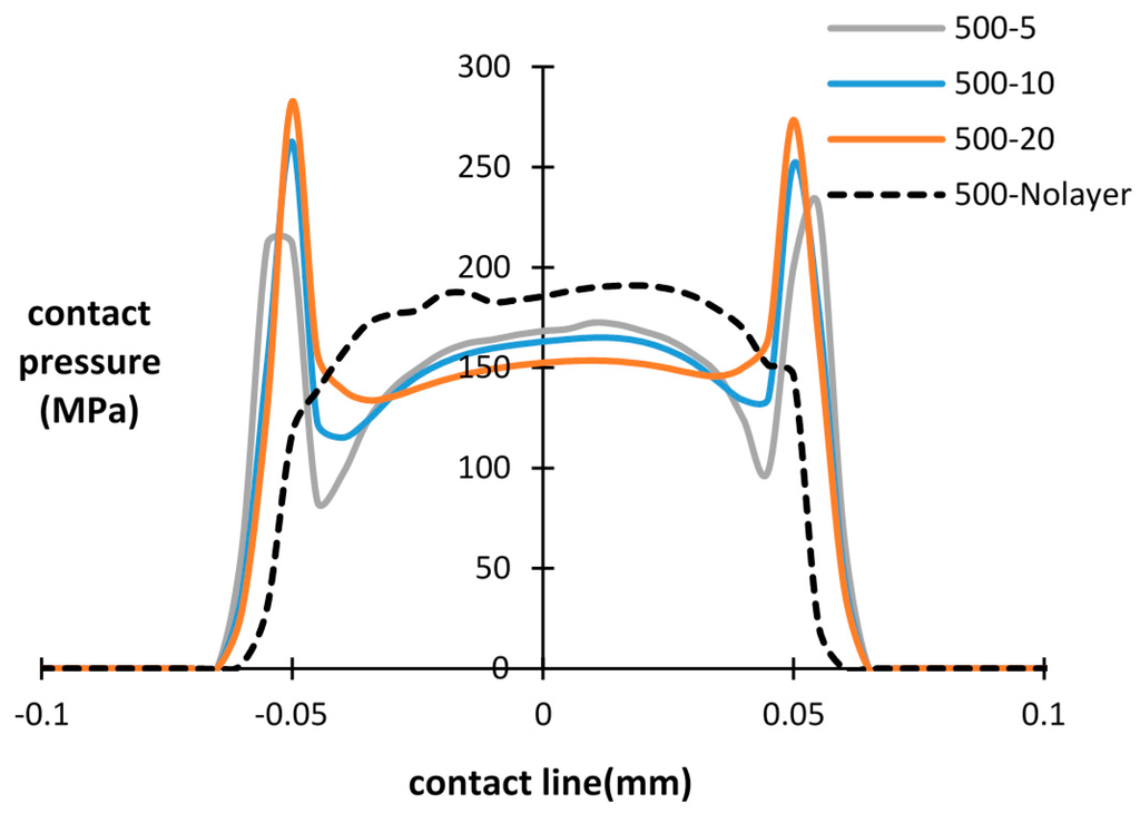 Contact pressure distribution for different layer thicknesses and number of cycles: layer thickness = 5 µm, 10 µm, 20 µm and without layer after 500 cycles.