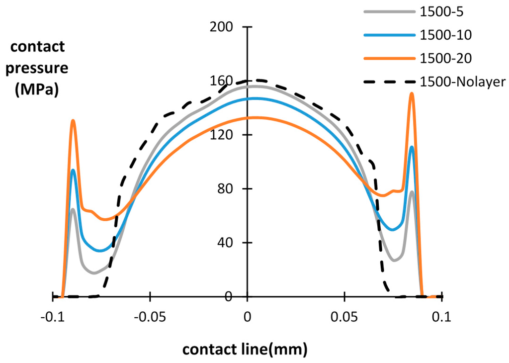 Contact pressure distribution for different layer thicknesses and number of cycles: layer thickness = 5 µm, 10 µm, 20 µm and without layer after 1500 cycles.