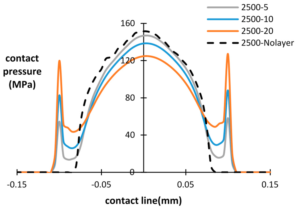 Contact pressure distribution for different layer thicknesses and number of cycles: layer thickness = 5 µm, 10 µm, 20 µm and without layer, after 2500 cycles.