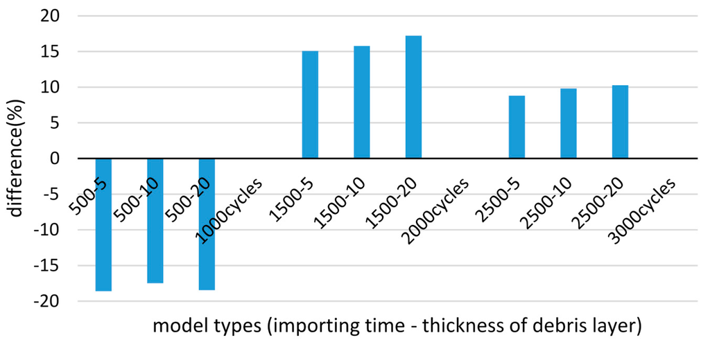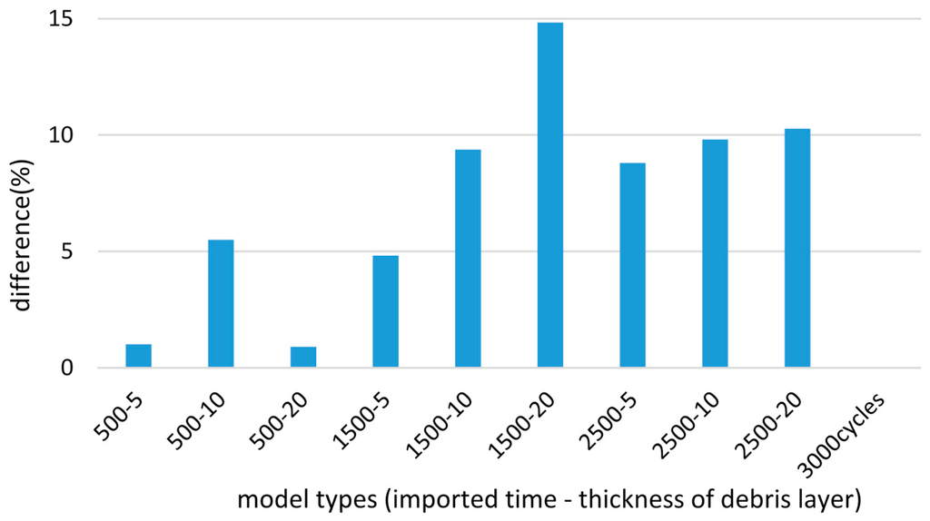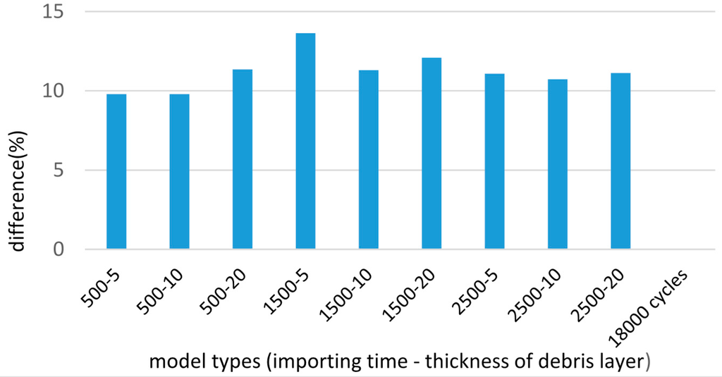 After the running-in stage, more wear damage occurs in most cases of the debris layer model (Figure 18). For the final cycles, the appearance of the debris layer brings more wear damage by 10% to 13.6% depending on the importing time and the thickness of the debris layer (Figure 19).