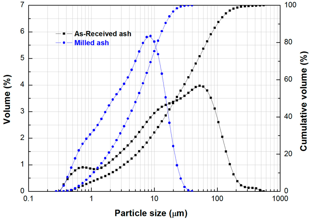 Particle size distribution for as-received ash and milled ash analysed by means of a laser diffractometer. Top cut (D97) particle size was reduced from 156.2 to 20.5 μm.
