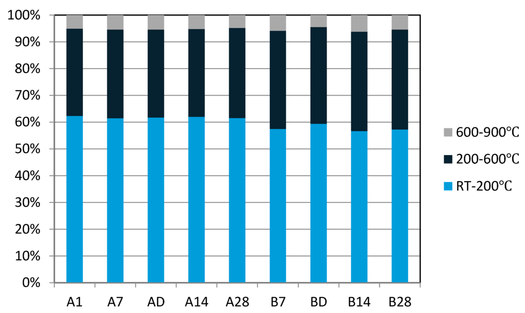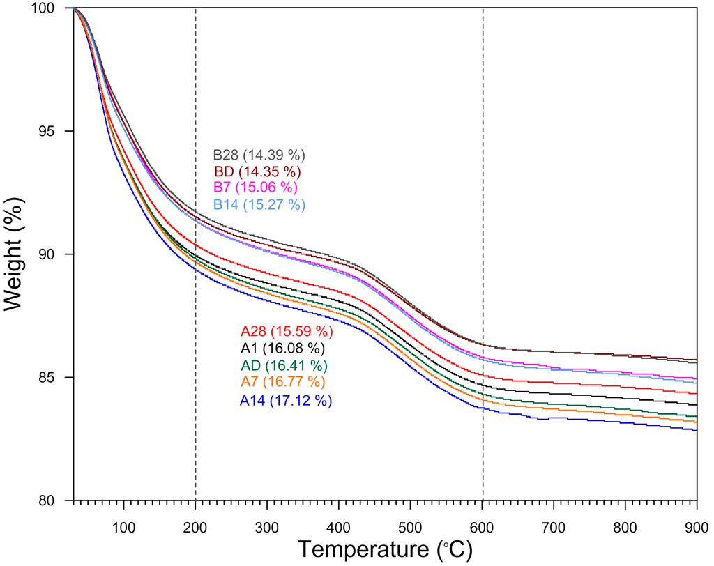 In thermogravimetric analysis, the weight loss from room temperature to 200 °C was higher in the sealed “A” series specimens than in the unsealed “B” series specimens (Figure 2 and Figure 3). The percentage weight loss measured over this temperature range represented about 61%~62% of the total weight loss in the sealed “A” series specimens, while it ranged from 57% to 59% in the unsealed “B” series specimens (Figure 2). However, the weight loss in the range from 200 to 600 °C was reversed; being higher in the unsealed “B” series specimens (36%~37%) than in the sealed “A” series specimens (32%~33%) (Figure 2). In other words, the sealed “A” series specimens lost relatively more moisture from room temperature to 200 °C and less moisture from 200 to 600 °C compared to the unsealed “B” series specimens. This observation is consistent with the unsealed “B” series samples having already lost some water to the atmosphere during aging so proportionally they have less water to lose during heating.