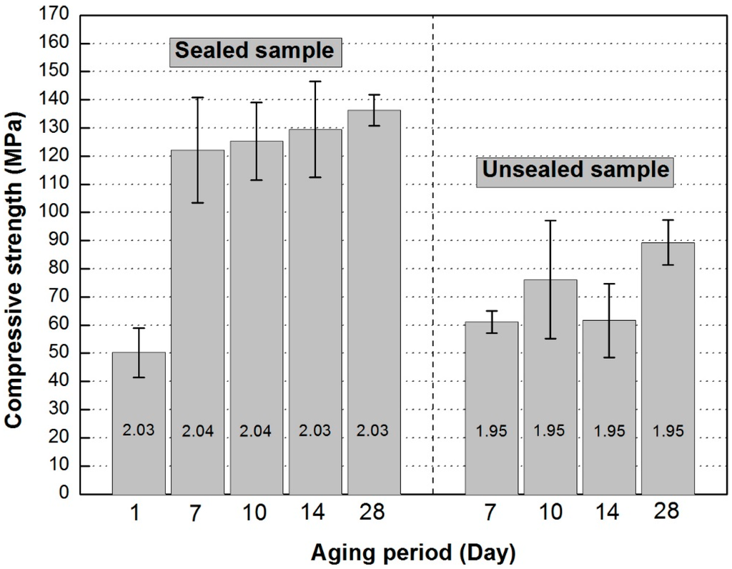 Compressive strength of geopolymers of the sealed “A” series specimens and the unsealed “B” series specimens. “A” series specimens in sealed moulds presented higher compressive strength at testing periods. Numbers in the bars are the apparent density (g/cm3).