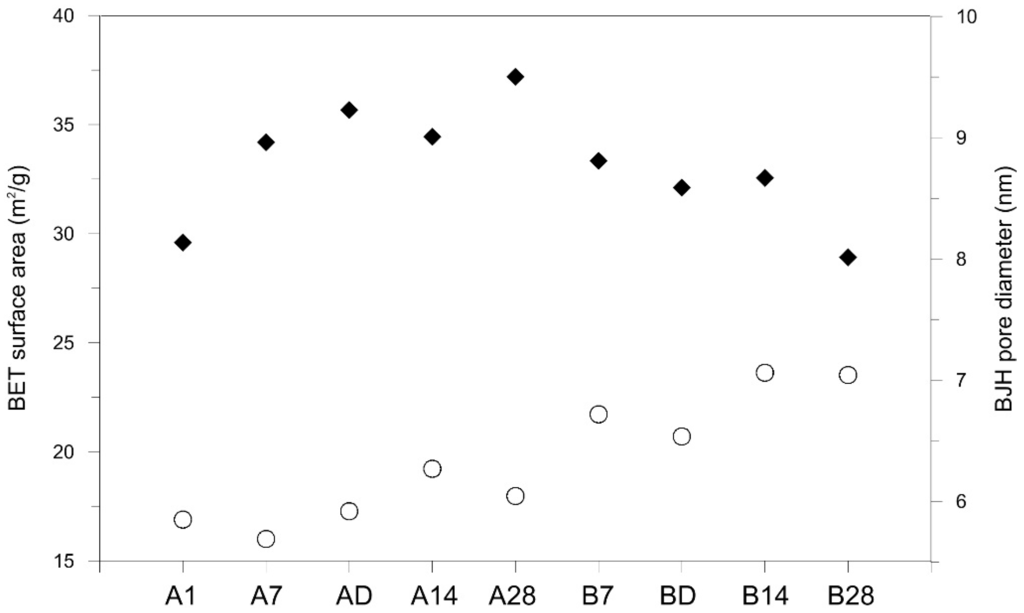 The BET specific surface area and BJH pore size distribution of geopolymers showed substantial difference between the sealed and unsealed geopolymers (Figure 5). The sealed specimens had larger surface area, about 34~37 m2/g, but smaller pore diameter, about 5.7~6.3 nm, for A7, AD, A14 and A28. The unsealed “B” series specimens had smaller surface area, about 29~33 m2/g, with larger pore diameter, about 6.5~7.1 nm (Figure 5). There is a clear trend of increasing surface area with aging time for the sealed samples. This in conjunction with increasing strength with aging time suggests continued evolution of the geopolymer paste for the sealed samples. There is a marginal increase in pore diameter with increase in aging time for the sealed samples that is inconsistent with the related increase in surface area but as the trend is weak this will not be pursued further. For the unsealed samples the surface area decreases with aging time and this is concomitant with an increase in pore diameter. One explanation for this is that the loss of water during aging is promoting consolidation of pores (increase in size) as dehydration forces come into play.