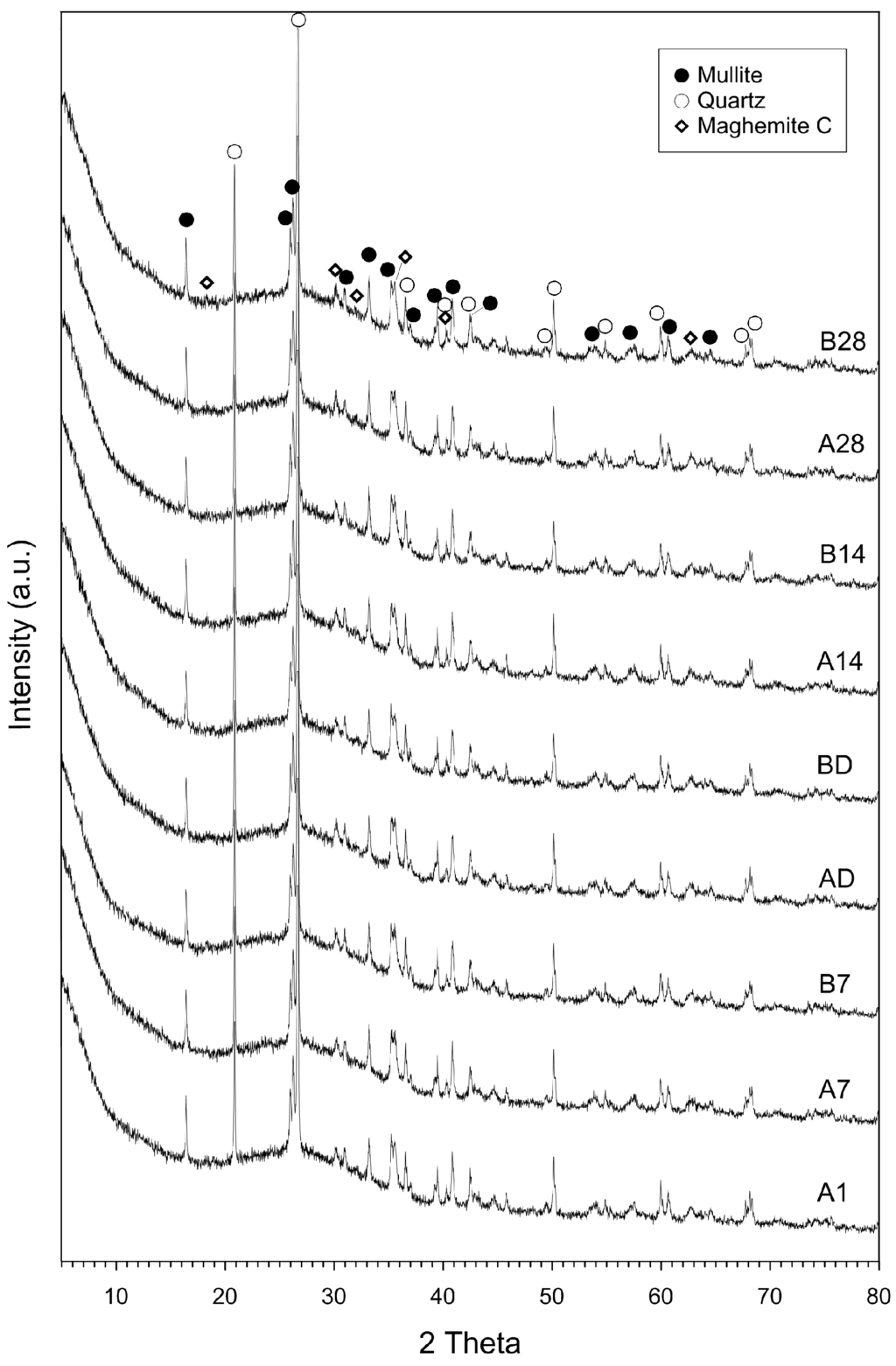 X-ray diffraction patterns of geopolymers described in Table 1. XRD patterns do not show any differences that could explain the substantial strength difference between the “A” and “B” series specimens.