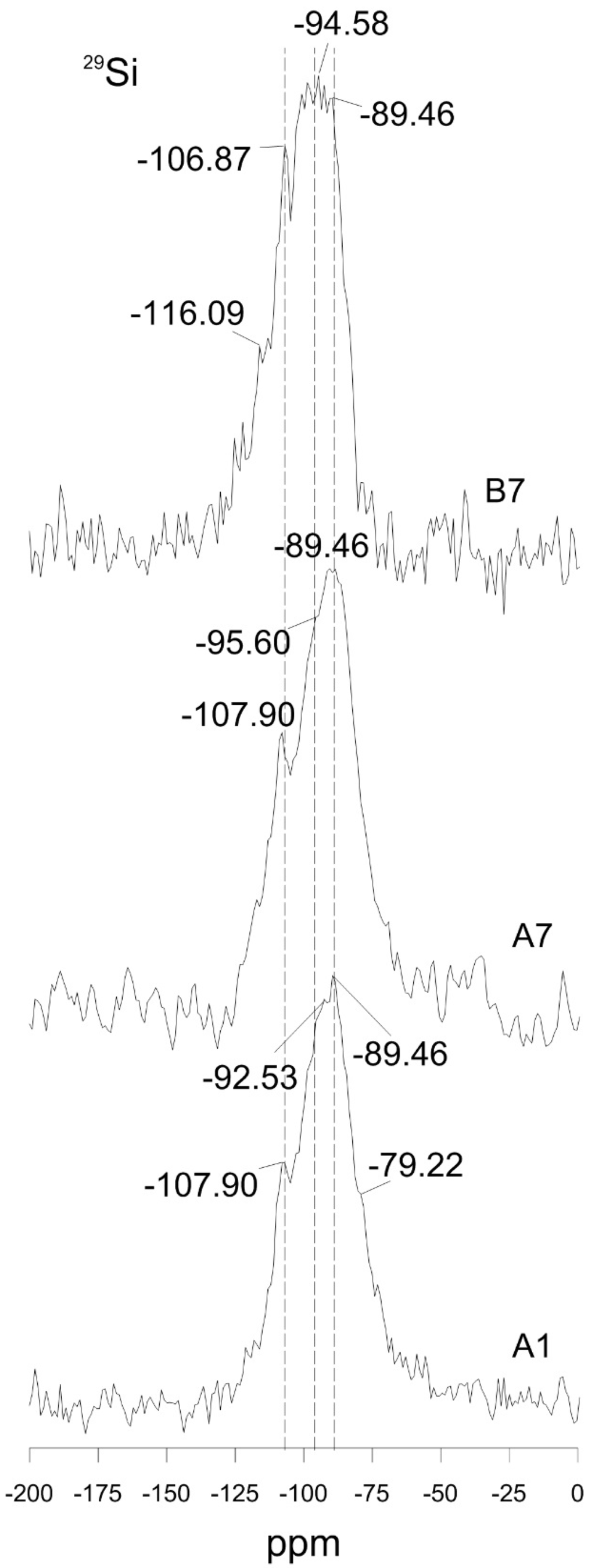 The 29Si Magic-Angle Spinning Nuclear Magnetic Resonance (MAS NMR) spectra were obtained using a 500 MHz Solid State FT-NMR (Varian Unity INOVA) spectrometer, operating at 99.3152 MHz. A spinning speed of 20 kHz was used with a delay time of 1 s and 2000 accumulations were used to collect spectra. The chemical shifts were measured with respect to zero reference from tetramethylsiane (TMS).