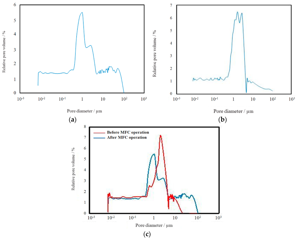 (a) Pore size distribution of a HGDL with composition FEP:PSf 75:25; (b) Pore size distribution of an AL/SS without HGDL (determined by Hg intrusion porometry); (c) Effect of MFC operation on pore size diameter.