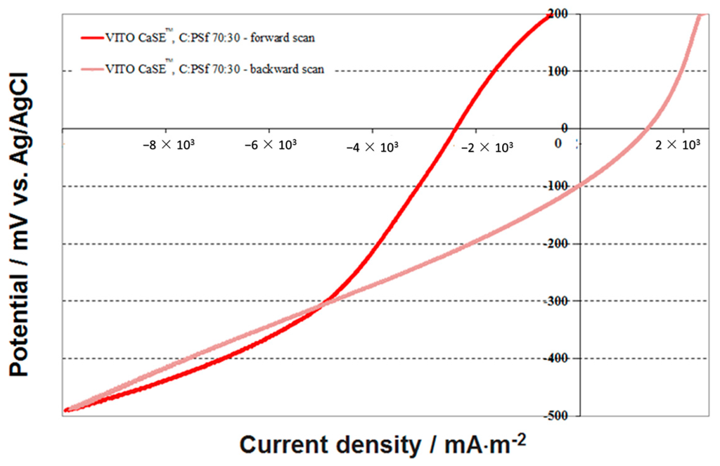 LSV traces for a VITO CaSE™ electrode (C:PSf 70:30), forward and backward scan (scan rate: 1 mV·s−1).