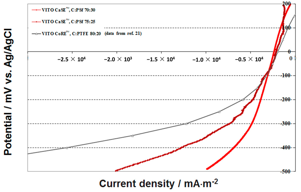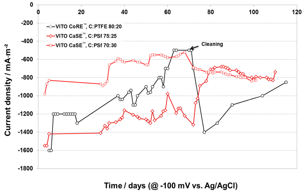 For the investigation of the evolution of performance with time, the cathode potential was fixed at −100 mV vs. Ag/AgCl and the cathodic current was monitored on a daily basis. VITO CaSE™ electrodes (FEP:PSf 75:25 in the HGDL; C:PSf 75:25 and 70:30 respectively in the AL) and one VITO CoRE™ were tested under identical conditions for comparison purposes.