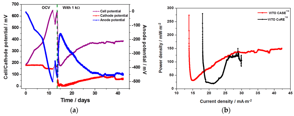 (a) Cell potential and anodic, cathodic half-cell potentials against time during MFC operation with VITO CaSE™ electrode as cathode; (b) Comparative power density profiles against time during MFC operation with VITO CoRE™ and VITO CaSE™ cathodes.