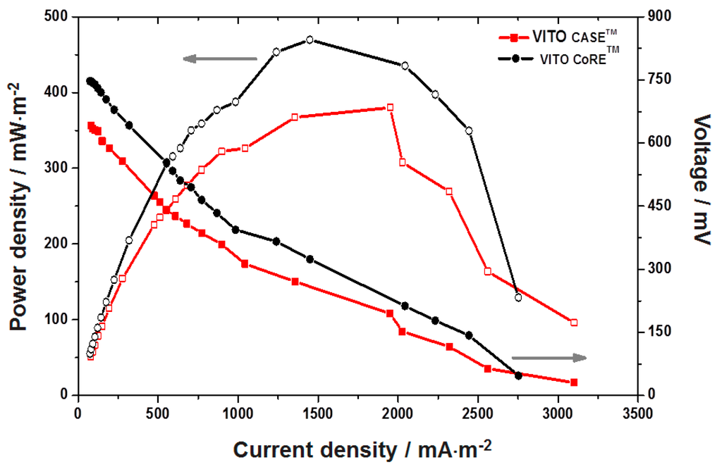 Comparative polarization profiles across varying external loads (10 kΩ–10 Ω) during MFC operation with VITO CoRE™ and VITO CaSE™ cathodes.