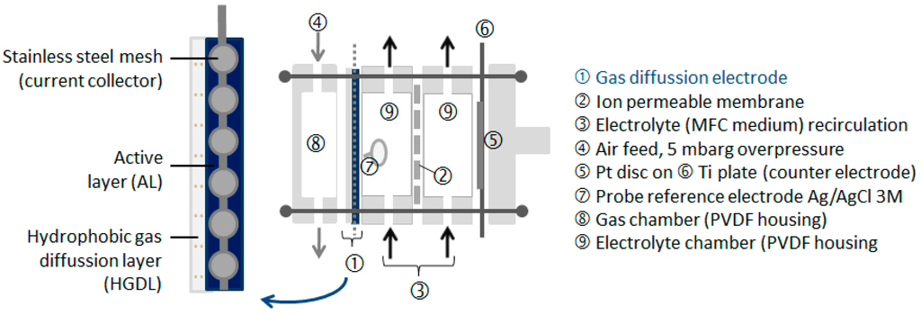 Similar to the anode, cathodes also play a very crucial role in enhancing the power output of MFCs by regulating the terminal reduction reaction. Various types of cathodes have already been tested for application in MFC, such as wet proofed carbon cloth, carbon fibers, graphite granules, carbon paper, Pt, Au covered Cu wires, graphite felt, graphite rod, graphite foam, graphite plate, carbon felt, activated charcoal, drilled graphite discs, reticulated vitreous carbon (RVC), etc. [,,,,,]. On the other hand, a variety of chemo/bio/electro catalysts also have been investigated as alternative cathodic catalysts in air-cathode MFCs [,]. Interestingly, uncatalyzed activated carbon has shown promising performance for the oxygen-reduction reaction (ORR) when compared to Pt []. Since low solubility of oxygen in aqueous solutions is one of the main problems, limiting the ORR by mass transfer, the use of gas diffusion electrodes (GDE) appears a promising option. GDE have large reaction areas and allow for higher mass transfer rates [].